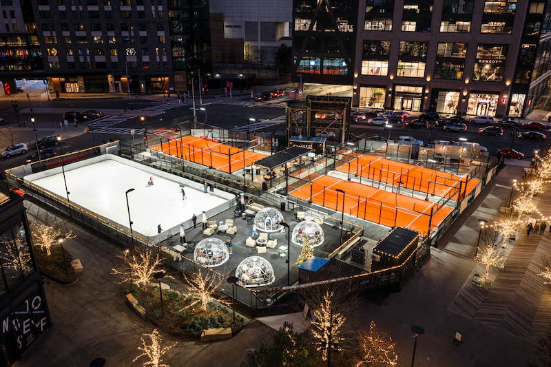 About a mile due north of PADELHUB, you’ll find Ballers Boston Seaport and its three seasonal outdoor Favaretti padel courts. In addition to padel, this second Ballers location (the first having opened last September in Philadelphia) also features a seasonal ice-skating rink, five seasonal pickleball courts, and private heated igloos where four to six people can dine and drink al fresco all winter long.
